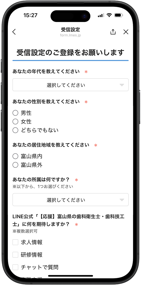 友だち登録時に送信されるメッセージの「受信設定」からご自身の情報をご登録ください。