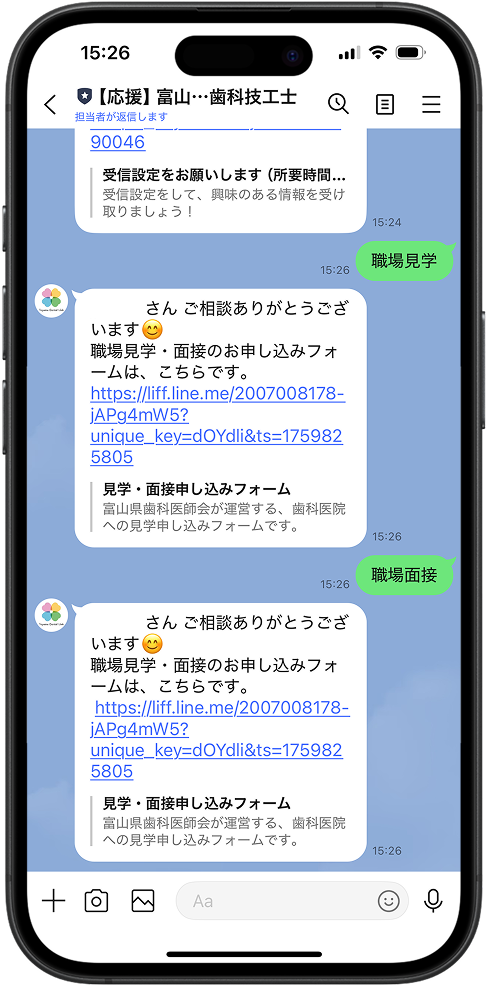 3メッセージで「職場見学」または、「職場面接」を入力して送信する