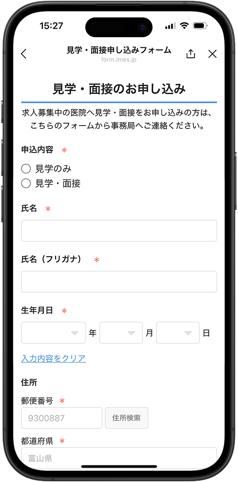 自動送信されるメッセージの“見学・面接のお申込みフォーム”を開いて、必要な項目をご入力・確認をいただき、最後に「送信」ボタンをタップしてください。